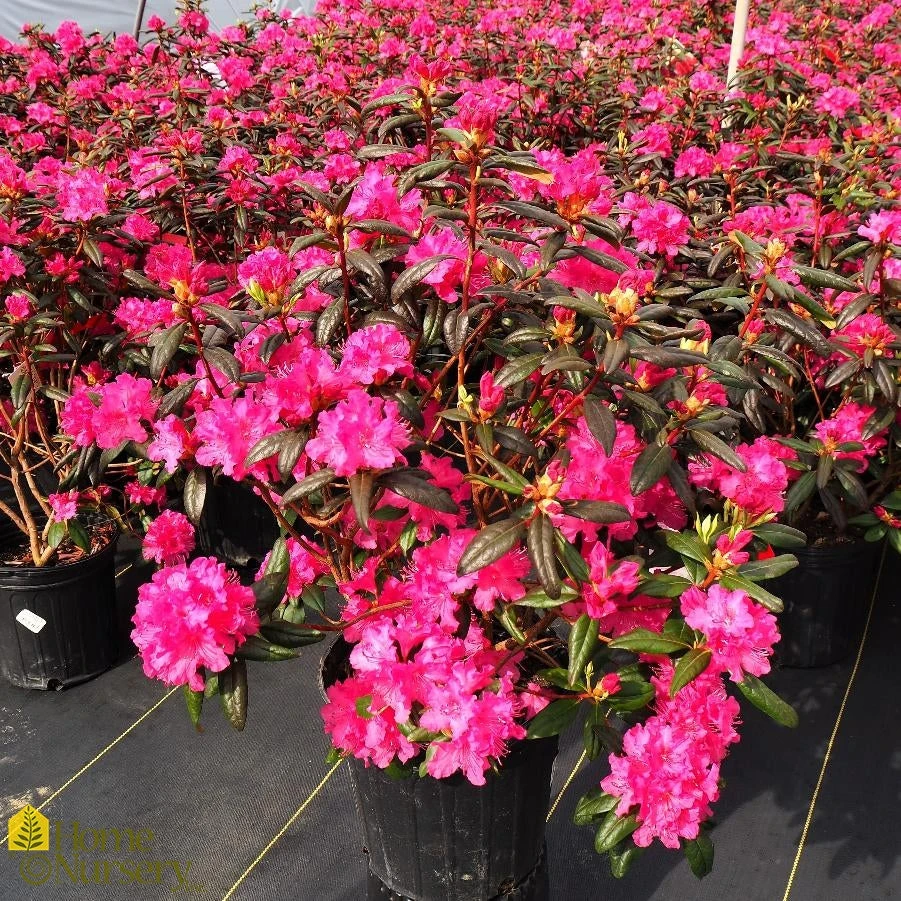 Enjoy cheerful spring color from this compact midseason bloomer that produces showy trusses of wavy-edged, deep fuchsia-pink flowers with a faint scarlet spotting. More sun tolerant than most, the small, dark green leaves turn bronze in the winter. Highly effective as an accent or hedge. Evergreen.