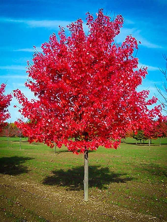 Considered one of the best for early fall color! The glossy green leaves provide a very dynamic show, as they turn a brilliant orange-scarlet when temperatures begin to cool. This large deciduous tree has a pyramidal form when young that becomes rounded with age. A wonderful choice for use as a high profile shade tree in larger landscapes.