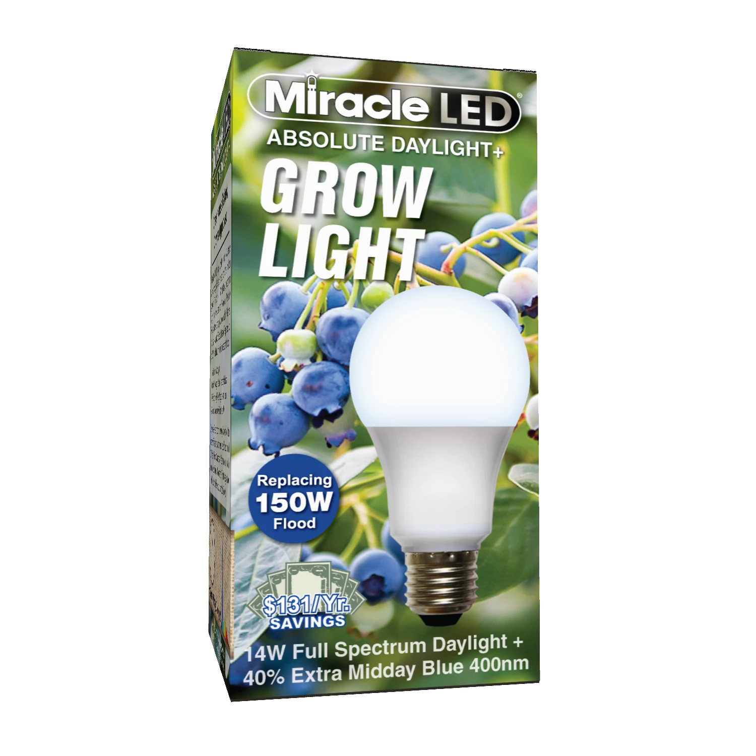 The Miracle LED® Absolute Daylight Plus Grow Light is a technological leap ahead for the indoor garden. Sipping only 14 watts of electricity, this green growing, blue spectrum LED replaces up to 150W old hot-running incandescent flood lights. Nearly zero heat output, Miracle LED® bulbs live up to 10x longer than standard bulbs, incredible blue spectrum light for maximum absorption. Contains no mercury & emits no UV. Chemical-free indoor growing is perfect for many different environments like small kitchen herb gardens, apartments with limited sunlight, or fruit and vegetable gardens in the basement.